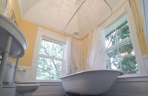 - The Meadow: The Meadow provides sleeping space for three guests- two in a queen bed and one on a very comfortable daybed. The daybed is a "CB2 Lubi Sleeper Daybed," serving as a great place to read a book, take a nap, or spend the night. Please let the innkeepers know if someone in your party will be using the daybed as an overnight bed so that they can prepare it with a mattress topper and sheets. The ensuite bathroom features a Victorian style clawfoot bath tub and dramatic chandelier in the vaulted ceiling: let the rest of the party go out while you catch sunset out the window from the bath!