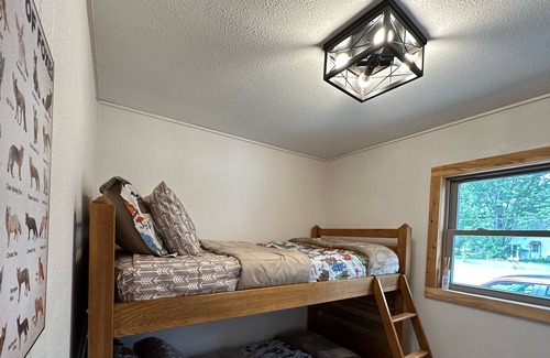 The Fox Den is a family-friendly getaway near Castle Rock Lake, Wisconsin and is perfect for indoor or outdoor activities and relaxation. It features a fox-themed cabin with three bedrooms, and private backyard with a playground. There are several entertainment options like TVs, DVDs, and board games. The cabin is well-equipped with amenities, including a fully equipped kitchen, smart TV, and WiFi.