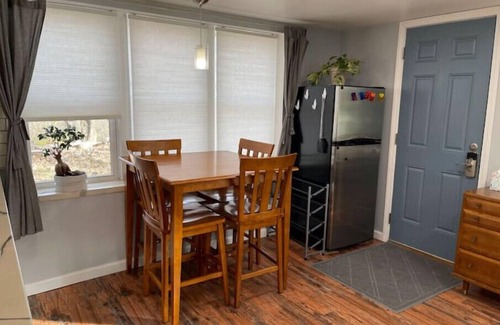 Although this efficiency apartment is in a basement, the large windows keep the apartment feeling open and spacious. There is a stovetop, microwave and toaster for cooking your own meals, as well as a 3/4 fridge. You'll also have access to wireless internet, a patio, fire pit and hot tub. At night, the path to and from the apartment is well lit for safe access. We specifically constructed the space with noise canceling features, but you may still hear guests above if there is someone staying in the upper portion of the duplex.