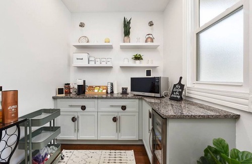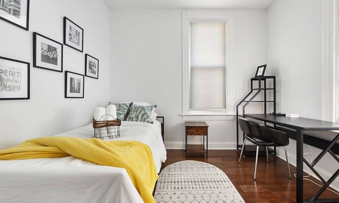 Want all the perks of a luxurious stay but don't want to spend an arm and a leg? Look no further than The Frick Room! This private bedroom in a beautifully renovated house sleeps two guests on two twin size beds. Equipped with a digital door knob that gives you peace of mind when it comes to safety and privacy. Utilize the kitchen and living room as shared common areas to make friends, or make your way back up to your room for restful solitude. We've got you covered with a workspace as well.