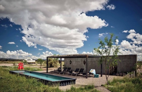 10 acres of uninterrupted landscape and views. Featuring outdoor dining area, fire pit, shaded lounging couch, container lap pool, bbq grill, outdoor shower and many more amenities to enjoy the beautiful West Texas sky.