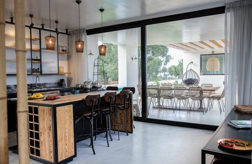 A continuous floor, without joints and with a smooth cement base, creates an authentic and elegant effect throughout the villa. The open plan kitchen has an iron structure with sliding glass doors that hide wooden shelves. Also, the marble worktop is created with iron structures and wooden compartments, inside which, besides storing various kitchen equipment, also hides the dishwasher and washing machine.