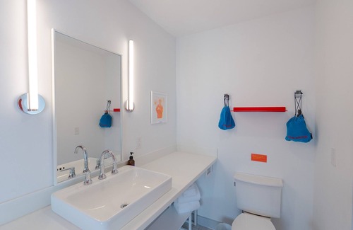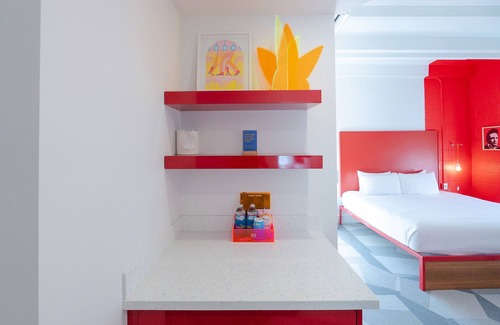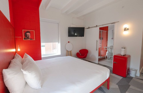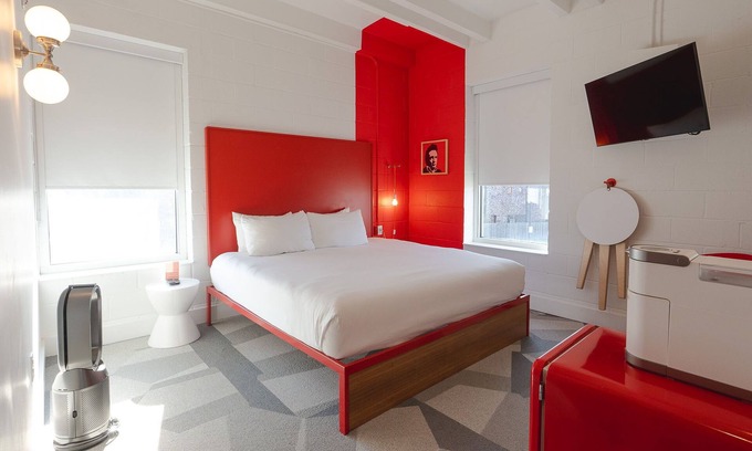 King Room 312 has one king bed, one full bathroom, vibrant color block walls, and is 275 SF. Attentive features include walls adorned with local art, a small basket of hand-selected local snacks, complimentary coffee, a Dyson hairdryer, a clothes steamer, a mini-fridge and much more!