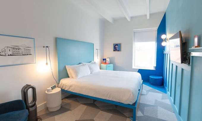 Room 319 has one king bed, one full bathroom, vibrant color block walls, and is 300 SF. Attentive features include walls adorned with local art, a small basket of hand-selected local snacks, complimentary coffee, a Dyson hairdryer, a clothes steamer, a mini-fridge and much more!
