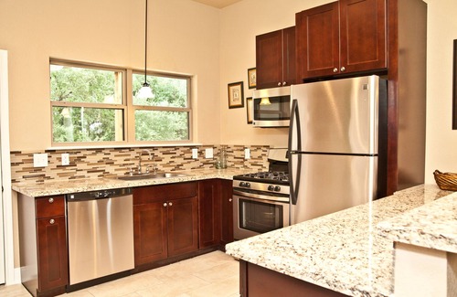 New build, designer decorated and color coordinated interiors, single story, 10’ ceilings, flat screen TV in living room, granite counters (in your kitchen and bath), fully equipped kitchen, tiled walk-in-shower and bathroom, washer/dryer in bathroom, ceiling fans and free internet.