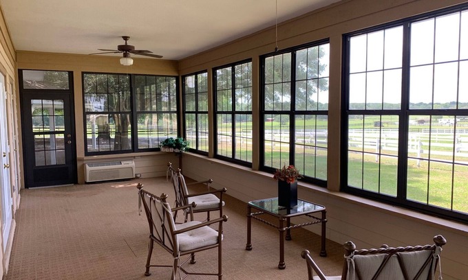 Enjoy yourself in our Garden home away from home. Great views of the Equine Arenas and only a few minute drive to The Villages Spanish Springs. This quaint yet beautiful escape could be just what you're looking for. A 2 bedroom 2 bath, with a pull-out couch that has a private sunroom patio. The carport also adds a nice touch to keep you dry if it rains and cool in the hot Florida sunshine!