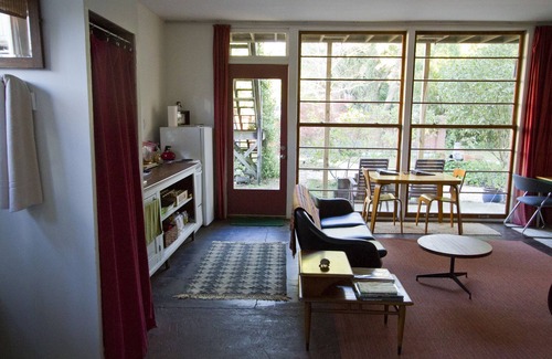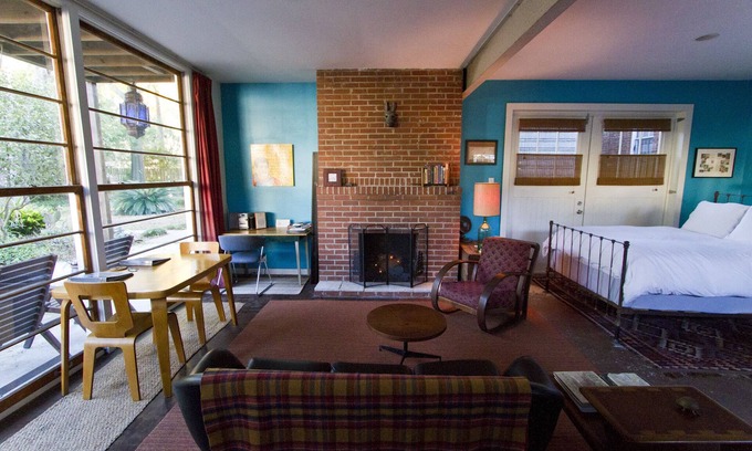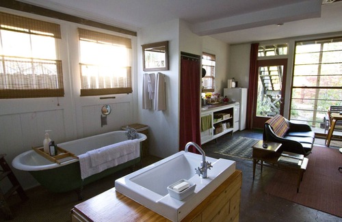 Nestled in Savannah’s historic Streetcar District, The Garden Studio at Half Moon House is a private retreat within the city, blending funky, mid-century modern style with a rustic cabin feel. This open-concept space features a kitchenette w/ essentials, an extra-long clawfoot tub w/ hand shower, and floor-to-ceiling windows overlooking a peaceful garden. Set in the historic carriage house behind a 1914 colonial revival home, it’s just minutes from Forsyth Park, Starland, and top restaurants.
