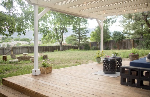 Find The Gathering House in a sweet neighborhood close to the mountains on the peaceful West side. Enjoy a Perfect VIEW of Pikes Peak. Open the back gate to open-space, trails, & a sledding hill. Centrally located & close by scenic Garden of the gods, Pulpit Rock, Ute Valley Park & USAFA. Enjoy nearby restaurants, a fire indoors or out, a large yard, twinkle light patio & fire pit. Newly remodeled, and newly finished basement with reading nook, fireplace, and karaoke set up. The home is comfy, cozy, & warm. Perfect for gathering.