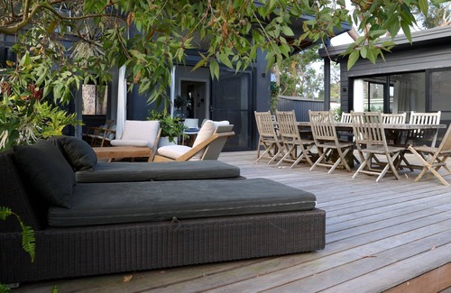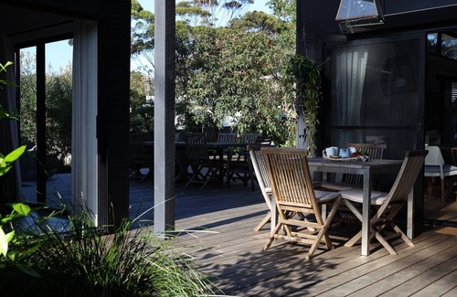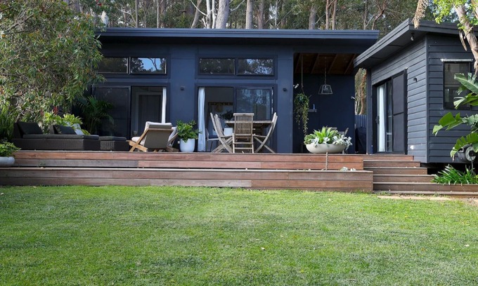 The Getaway Manyana is a cozy beach shack located in a lovely garden setting with a backdrop of gum trees.