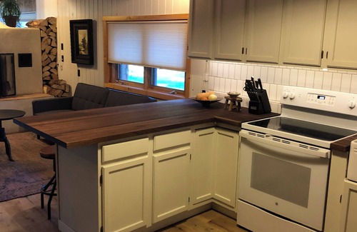 Recently the interiors were renovated to retain its original warmth & charm while updating the interior surfaces, fixtures, furnishings, and installing high speed internet. Now you can enjoy the wooded scenery from a stately Writer’s desk in the sunroom, the view of the cliffs from the upstairs loft “cuddle couch”, or relax into one of the big leather chairs in the living room to read a book or stream a new movie.