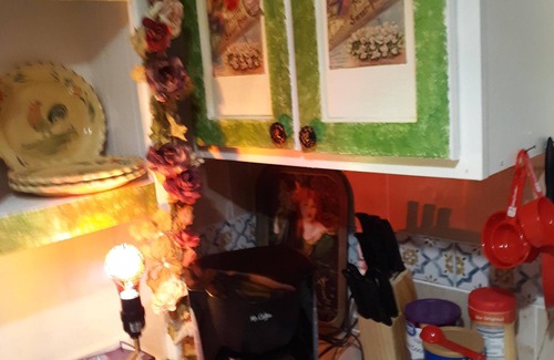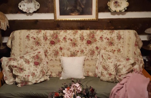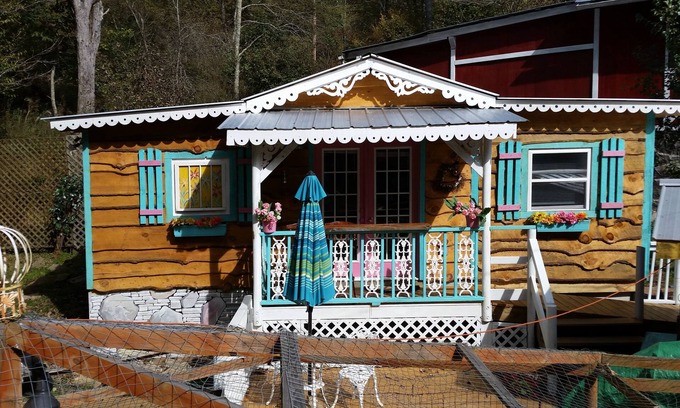 The Tiny Gingerbread Home is really like a little storybook retreat that has everything you'll need for a comfortable stay. It has a little living room, little kitchen, little bedroom and little bathroom. It's decorated with antiques and many touches that would make Hansel and Gretel feel right at home! It has a comfortable twin daybed that doubles as a couch in the little living - room. The kitchen has a refrigerator, microwave, convection oven, a two burner stove top,and a coffeemaker. The little bedroom has a desk and there's room for luggage and hanging clothing. There is also a little dryer to dry the clothing you can wash in the mini washing machine, that sits next to the sink in the kitchen. The Gingerbread has its own little porch and a deck that sits right above the Aviary. It's right next to the Gingerbread FarmYard.
