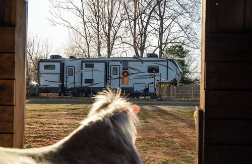 The Glamper at White Oak Stables sits on a 24 acre horse farm and shares space with a gaggle of barnyard characters.