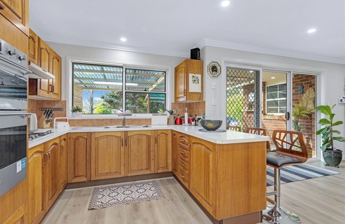 NOTE** During peak periods checkout is 10am and no late checkout will be given. Just around the corner is the Basin which has the best boat ramp in Jervis Bay, a park for the kids, jetty for fishing, local shops just up the road, coffee van and heaps more around. This home is light bright and very modern after undergoing a full internal renovation. Sit out on the lovely back deck and watch the family play in the backyard or do some star gazing at night. The double garage is all decked out to play games, chill out or put the teenagers out there and you will have a relaxing time. This village is very peaceful and friendly so when walking around you will see a lot of happy faces smiling back at you. The living space is large and central to the kitchen and back deck. Ensuite to the primary bedroom, the front room has a queen bed and also a tri-bunk bed (double bed and above it is a single bed). All other rooms have queen beds and ample wardrobe storage.