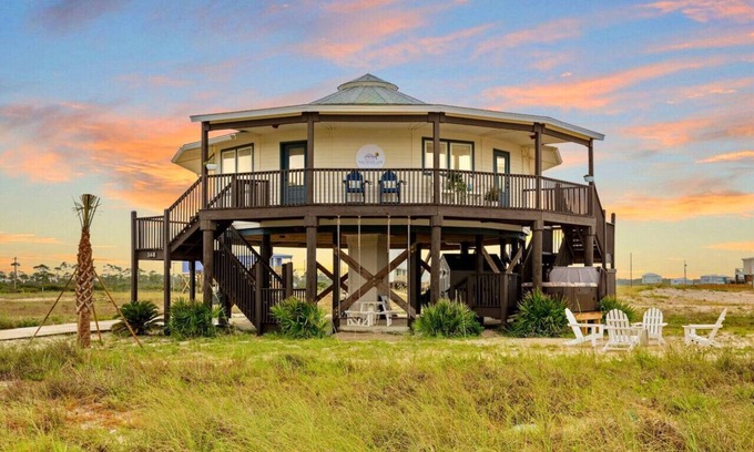 Nestled in a serene location with no other homes on our street and just a short 50’ walk to beach access, this Gold Fortified Round Beach House offers an unparalleled getaway. Bask in stunning views of both Mobile Bay and the Gulf of Mexico from every angle. Whether you’re seeking adventure or relaxation, "The Good Life" is your perfect coastal retreat.