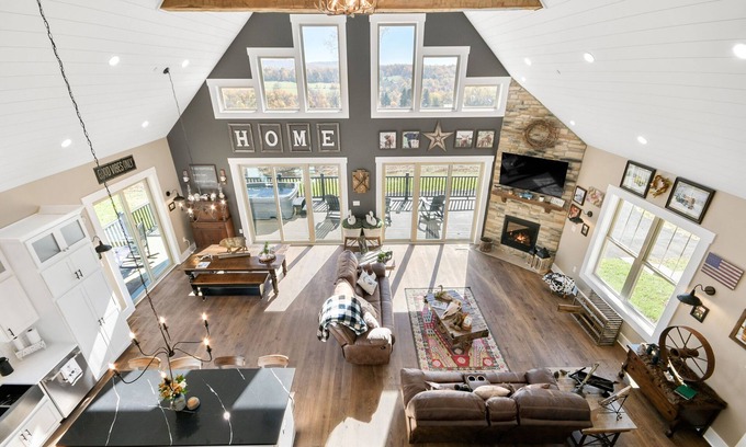 - Spacious Accommodations: The soaring A-frame design offers ample space for large gatherings, featuring multiple living areas, including a great room, lower-level family room, and game room.