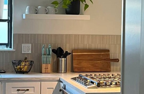 The updated bathrooms include Kingston Brass faucets and stylish, modern decor, plus plenty of essentials like plush towels, toiletries, and hair dryers.