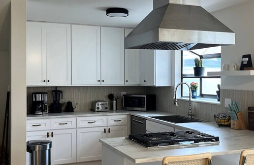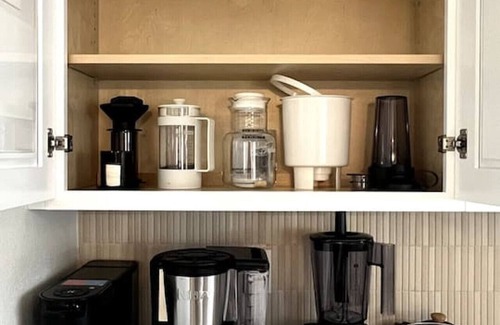 The kitchen is also equipped with a fully-stocked coffee station, offering options for Keurig, French press, pour-over, and more. A formal dining table seats 6, while a smaller breakfast table seats 4—perfect for quick meals or morning coffee.