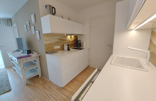 The associated parking space for 1 vehicle is right next to the apartment. Due to its ground-floor location, the Grimminglounge apartment is also suitable for wheelchair users. The shower access is almost