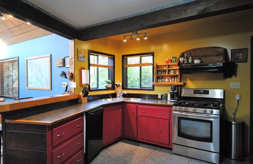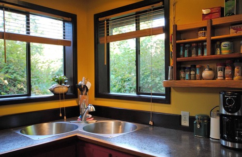 An open concept chalet style house with high ceilings, lots of natural light/windows and plants. The Hacienda is a bright, clean, well-stocked house with everything you need to make your stay enjoyable.