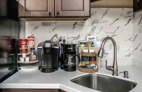 - kitchenette includes 2-burner induction stove, sink, top-freezer fridge, toaster oven, microwave, mini appliances (more upon request)
