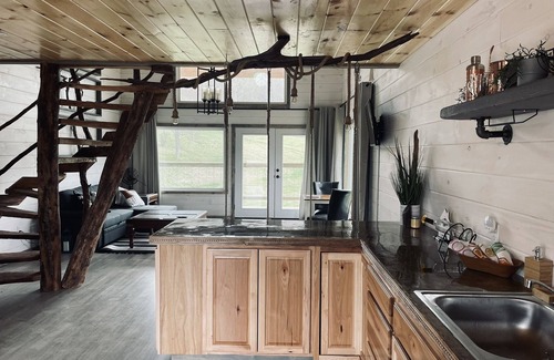 The "Hang-over" is one of three rental cabins on the property and features a spiral tree staircase built from naturally resourced materials on the winery grounds, a loft bedroom, covered outdoor space, interior swings and amazing views!