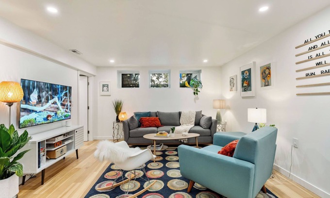 Welcome to The Happy Place suite, where creativity meets comfort in a thoughtfully designed space within a beautiful 1908 Craftsman home. Set on the lower level, this suite is designed for relaxation, with natural light streaming in through well-placed windows. Here, you’ll rest easy on cozy Casper mattresses, wrapped in soft cotton sheets and fluffy pillows. Your morning coffee becomes an experience as you settle in on your own covered patio, watching the neighborhood life unfold.