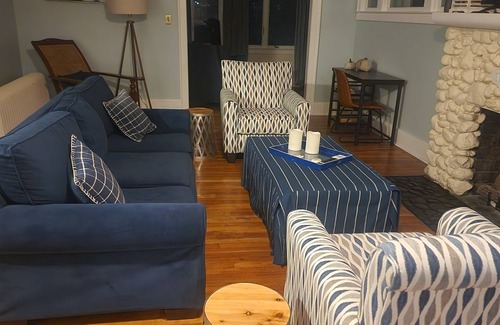 This floor includes a private master bedroom with a King-size bed and a sunroom separated from the living room by a privacy screen containing a large day bed. There are also 2 twin roll-away beds and a 21" tall, pillow-top self-inflating queen size air mattress. These may be placed in either the sunroom alongside the day bed or in the oversized water facing living room which also contains a sleeper sofa. Aside from the sofa bed, the living room seats an additional 5 persons and has a gas burning fireplace. This is a new B & B so all the linens are new and much of it has been freshly painted or is in the process of being updated. This floor also includes a very large kitchen and eat-in water facing dining area that seats 6 people.
