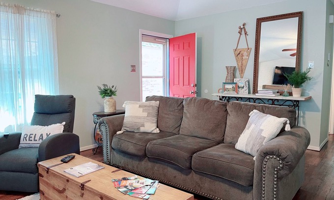 Make yourself at home at The Haven at Chapel Ridge, a freshly remodeled, stylishly furnished 2 Br/2Ba home on quiet tree-lined street off Chapel Road in Waco, Texas. This charming cottage-style home has an open, airy feel. The home has a spacious primary suite (13'x17') with walk-in closet. The second bedroom has both full and twin beds. There's also a roll-away twin bed tucked away in a closet if needed. With 20 (yes, 20) pillows in the home, you’re sure to find one perfect for you!