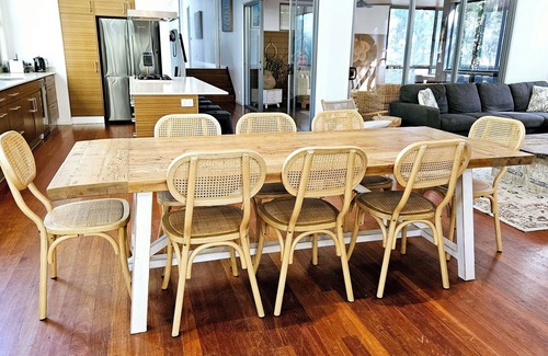 This luxurious 4 bedroom home of generous proportions, has a well equipped kitchen , 4 bedrooms, 3.5 bathrooms with a bathtub to relax in, sleeps 10, your own privately screened outdoor deck , together with a second veranda style deck with a lux BBQ and 10 seater outdoor dining table. The large living area has a comfy sofa, 5 barstools and a large indoor dining setting as well.
