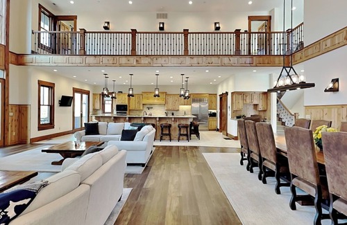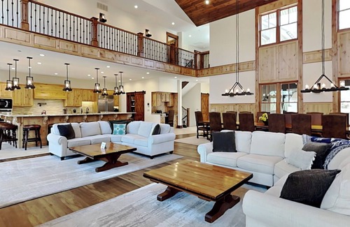 Featuring an open central gathering area on the main level, The Haven has soaring ceilings in the impressive great room, which includes ample seating, a floor-to-ceiling fireplace, and a wall mounted TV.