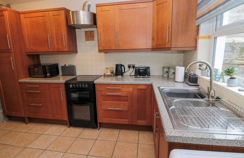 Amenities: Electric central heating. Electric oven and hob, microwave, fridge/freezer, washing machine, dishwasher, kettle, toaster. TV, WiFi. Hairdryer. Power and enough logs for a first fire inc. in rent. Bed linen and towels inc. in rent. Roadside parking. Front non-enclosed patio with bench, and rear enclosed patio with summerhouse and furniture. Two well-behaved dogs welcome. Sorry, no smoking. Shop 0.6 miles, pub 0.1 miles, beach 1.3 miles. Please note the staircase is steep and may not be suitable for those with mobility issues