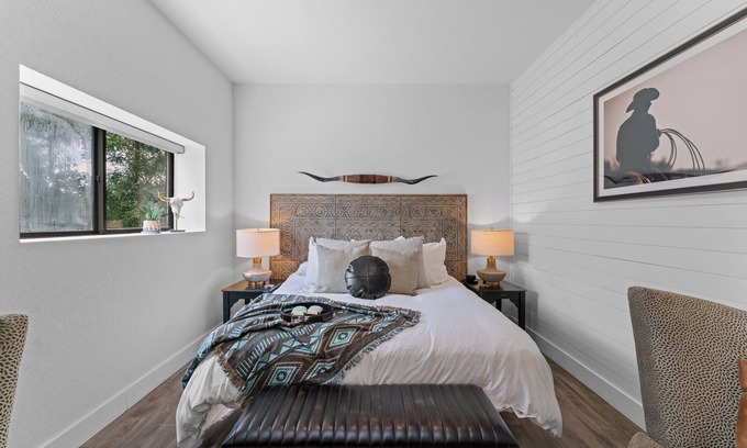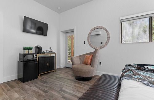 A refined and modern twist on classic Hill Country charm, this peaceful retreat offers a true escape. Tucked away in a serene setting, it’s the perfect spot to unwind and recharge while also being steps away from local downtown establishments. The Hayes features a private exterior entrance, plush king-sized bed, huge oversized tub + shower combo, smart TV, mini fridge, microwave, and coffee maker. Step outside to enjoy cozy outdoor seating on the patio. All rooms in Bulverde Lodge are non-smoking and NO PETS are allowed on the premises.