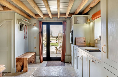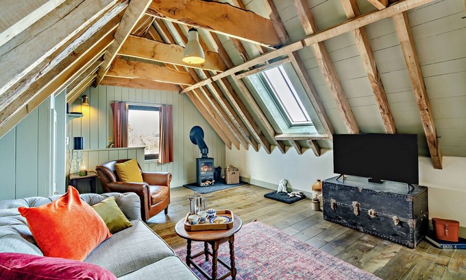 Original ceiling beams, and tongue and grove panelling enhance the character of this enticing rural getaway. Enter from the patio, past an area for coats and boots, and step into the charming, country-style bespoke kitchen. Stocked with all you need to rustle up delicious meals, it houses a small wooden dining table and chairs. Leading off the kitchen is an opulent bathroom, housing a splendid antique copper bath and a corner shower. Climb the stairs to a spacious open-plan living room, with a fine vaulted ceiling and lovely country views from every window. A sumptuous chesterfield and an antique leather club chair provide comfortable seating, with a cosy corner wood burner. At the opposite end of the room is a gorgeous, king-size brass bed, dressed in pretty linens. Cushions, rugs, lamps and small items of vintage furniture add to the charm of this inviting space.