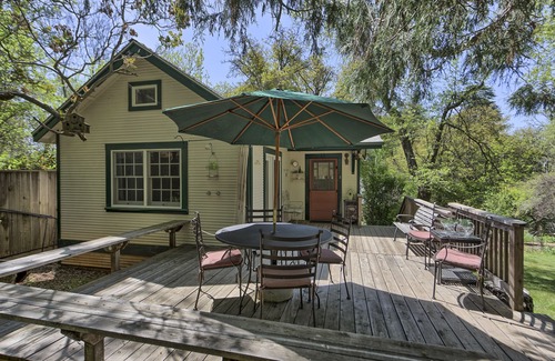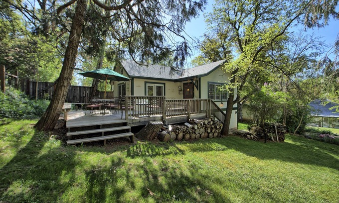 The Heard House, in the heart of downtown Murphys, is a sweet, single-level cottage completely rebuilt in 2008 with all the charm and character of a bygone era, thoughtfully updated with today's comforts and conveniences. Easy walking distance to everything downtown, including the Murphys Hotel, shops and restaurants, two dozen wine tasting rooms, community park and river. Located on a sunny and fenced 1/3 acre parcel in a residential neighborhood just one block off Main Street, the cottage is nicely set back at the rear of the property and hidden from the street, so you have all the privacy you crave, without the traffic and noise issues of downtown. The open and airy living room has vaulted ceilings and a toasty gas fireplace. The kitchen is well-stocked for cooking and entertaining, with coffee beans, half and half, teas and spices, a vintage gas stove, microwave, coffee maker, coffee grinder, blender, and breakfast bar seating. Five star amenities like chocolates by the bedside, fresh flowers, snacks and free WIFI have it stand out from the rest. The bedroom has a queen-sized bed, with down comforter and duvet cover. The bathroom has vaulted ceilings, skylight, a clawfoot tub/shower combo, hair dryer, and hotel toiletries. Split unit Heating and AC, ceiling fans in the living room and bedroom, and a gas fireplace for your comfort. Private deck with bench seating and an umbrella-shaded table is the perfect spot for relaxing with your morning coffee, plus a gas BBQ, outdoor shower and a horseshoe pit you’re welcome to use. Relax and enjoy watching the squirrels, birds, turkeys and occasional deer that frequent a large, open area behind our property, or grab a night time beverage and take in the starry sky. Fully fenced yard, and at times it will be shared with our dog. If you're looking for somewhere special to relax and unwind, the Heard House is a perfect place to call home