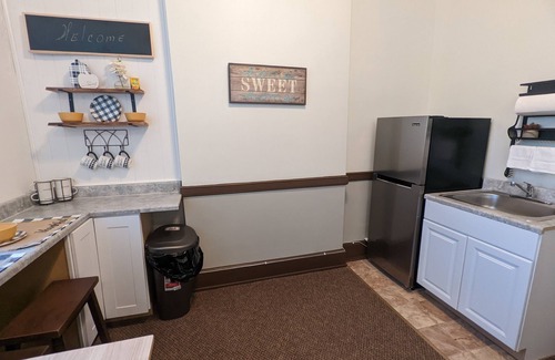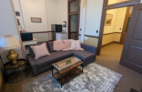 The home is on the second floor, 1 flight of stairs, and is equipped with a small kitchenette with refrigerator, sink, microwave, coffee maker and toaster oven. The kitchen overlooks the living room and features a pullout sleeper sectional and smart TV before entering the spacious bedroom with queen bed and a full bathroom.