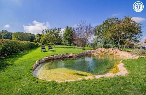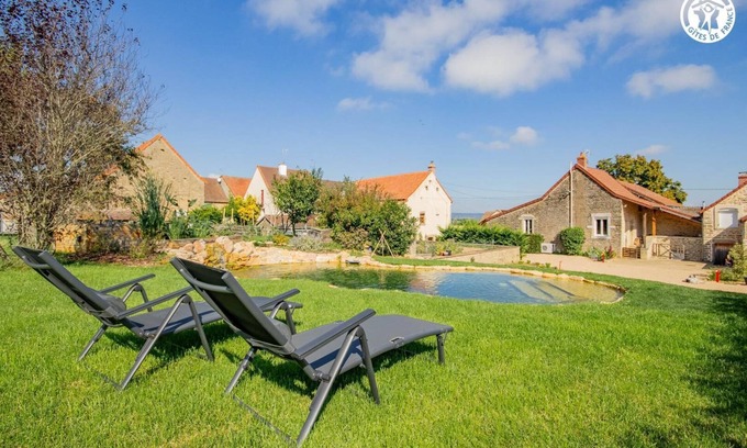 Margareth & Mickaël welcome you to an authentic 19th century winemaker's residence, carefully restored (former wine & agricultural estate) nestled in a quiet "mini impasse" & edge of wooded meadows, a stone's throw from the vines, in the heart of a picturesque little hamlet leaning "on a balcony" on the hillside, a choice belvedere offering a magnificent unobstructed view of the surroundings as far as Mont-Blanc on a clear day! Total tranquility in the countryside, nestled in the hollow of a sublime undulating landscaped setting, succession of vineyard hillsides, forests, rivers & meadows. Absolutely enchanting landscapes & panoramas. Typical & preserved wine village of the Côtes Chalonnaises - one of the oldest with its cooperative cellar producing several AOCs - Bissey-sous-Cruchaud has a leisure area (city stadium, slide, various children's games, mini football stadium) & benefits from a superb preserved rural & natural environment. Very comfortable cottage. Warm country character with a contemporary spirit, mixing traditions & modernity, enhanced by the exotic soul of the place (stone fireplace mantel, beams & ceiling, framework ... original). Lots of charm. Cozy atmosphere. Sheltered balcony-terrace (on the same level as the cottage) overlooking a pleasant enclosed garden of 1000m² (with electric gate) carefully landscaped (planted, planted with trees & flowers), with a swing & a very rare unusual "organic swimming pool" in natural swimming of 8x4m. Composition: Semi-detached gîte with owners' home (total independence). Wifi (fiber). Wood central heating. Wood stove. Air conditioning. Raised ground floor (4 steps): living room-kitchen-lounge, 1 bedroom (double bed 160x200cm), separate toilet. 1st floor: 1 bedroom (double bed 140x190cm + 1 single bed 90x200cm), shower room (shower/toilet). Private balcony-terrace. Enclosed grounds (1000m²) with shared biological swimming pool (8x4m). Private parking. Bicycle storage. Shops including supermarket 3 km away.