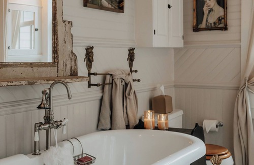 The house features 4 comfy bedrooms, impressive living & dining areas, chef's kitchen, vintage bathrooms with clawfoot bathtubs, high ceilings, rustic & refined decor.