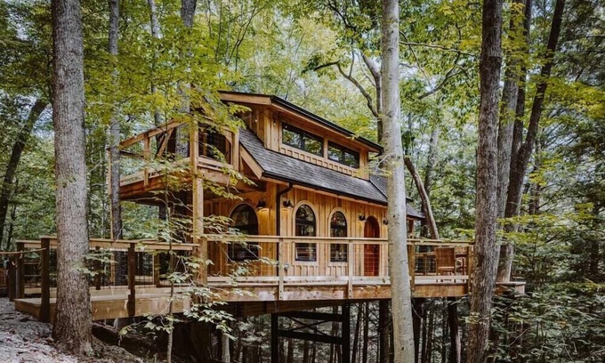 The Hickory Treehouse is the perfect retreat for rest, relaxation, and reconnection surrounded by nature. Features a suspension bridge overlooking the entire property, hot tub, fire pit, charcoal grill, large wrap around deck, large walk in shower, loft bedroom, dining area and large living room.