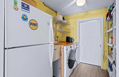 The laundry is in a separate room off the attached one car garage. Both laundry machines are new this year. We also have a drinks fridge in the garage if you need any extra refrigerator space, and extra storage in this area for any personal items or home supplies.