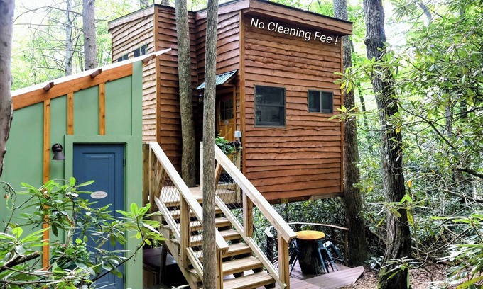 Sleep cozy among the trees in this authentic treehouse while listening to the sounds of the waterfall below. Enjoy hiking on our 33 private acers adjacent to the Cherokee national Forest or relaxing in the hot tub on the deck below.