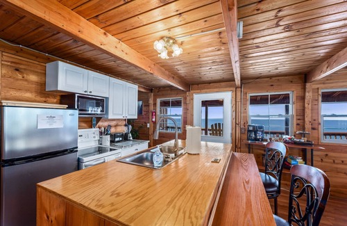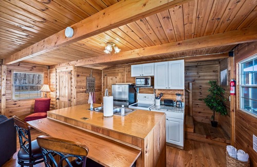 As you enter the cabin, you'll take in the exposed wood walls, making the great room feel cozy and welcoming. The comfy couch is perfect for watching TV or enjoying a glass of wine in front of the fire. The open kitchen design allows for great cooking space and a breakfast bar.