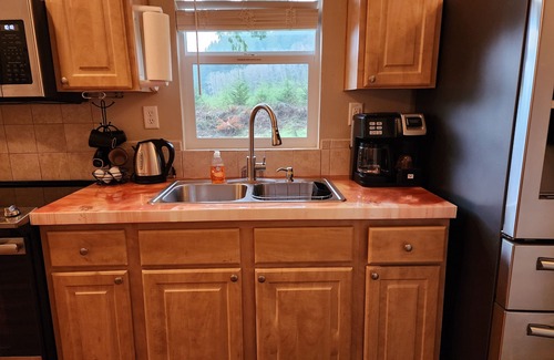 Very peaceful, private tiny house renovated in 2020, offers a huge newly built covered deck facing the valley. Large evergreen trees and lush ferns throughout this magical property, Elk Creek runs through the land and you can hear the Calawah River nearby. The house is equipped with everything you may need to make your stay enjoyable.