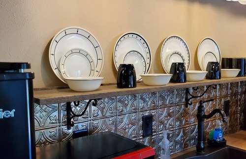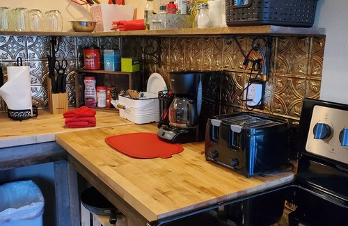 The kitchen has most of the basic kitchenware/cookware/dining ware that may be needed to grill or cook. There are a few staples on the shelf and fridge for your use.