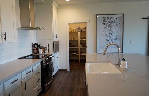 ~ A fully equipped kitchen with high end Gallery stainless steel appliances, dishwasher, oven, stove/air fryer, fridge, and microwave. A pantry that holds everything you need from a coffee machine, Keurig, tea machine with tea packets and sugar, panini maker, and more. Extensively large island with countertop seating.