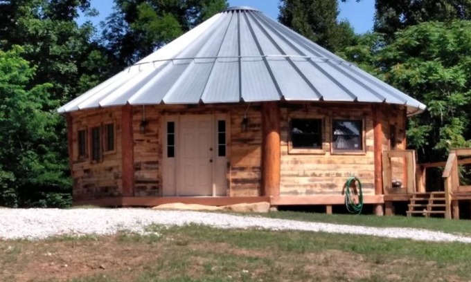 Our Highlander Rustic Yurt is an extremely unique round cabin — a true octagon and it's unlike any cabin in the world. The eight main logs were harvested from great Ash trees located on the Rustic Ravines property. The trees were infected with the Ash Beatle and dying so we took them down and used them for the 8 supports for our 2 Rustic Yurts and our Gazebo. Each roof is a galvanized steel Corn Bin roof and the each have 20-feet high domes in the center.