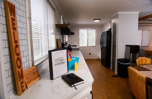 The living, dining room & kitchen are a mix of modern and retro - a fantastic cross of luxurious comfort and nostalgia. The kitchen is stocked with all the dishes & cookware you could possibly need, It includes a refrigerator, water cooler, pantry, microwave, electric griddle, oven & range, and of course a coffee maker!