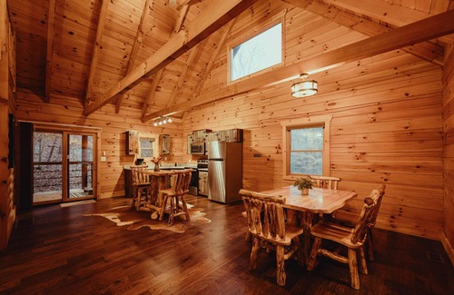 The Hilltop cabin is a perfect getaway for family vacations, friends' getaways, or group adventures! With two bedrooms (queen, full), a large loft (queen bed), and a fully equipped kitchen, The Hilltop is ideal for up to 6 guests. Enjoy the outdoors, nature, and fun in this serene retreat. Nestled in a premier hiking area, this cozy, pet-friendly cabin is minutes from waterfalls, caves, and scenic trails. Relax in the spacious lounge with a pool table, enjoy cozy movie nights with Roku TV and Wi-Fi, and unwind in the private hot tub or around the fire pit.