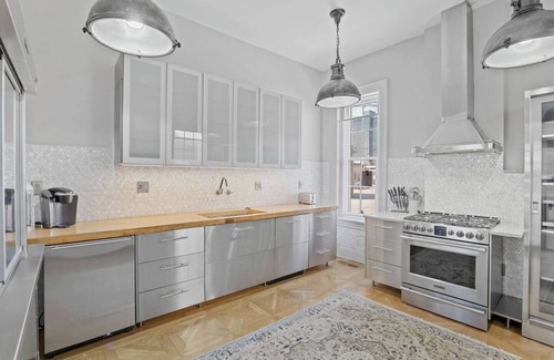 On the second floor, enjoy two full bathrooms and three bedrooms. The primary suite has a king bed with a TV, an extra "nook" area with a chaise lounge (can sleep one guest) and an attached / en suite bathroom with a luxurious steam shower and clawfoot tub. The second bedroom also has a king bed with a TV. The third bedroom has a queen bed with a bonus nook with a trundle bed (two twins). The house can comfortably sleep 8 guests in beds and 1-2 more guests on the chaise lounge in the primary suite (see photos).