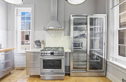 You can access the house from the back or from the front door. The first floor space is beautiful and dramatic, with high ceilings, historical details, and gleaming hardwood floors. The front foyer with the pool table is open to the adjacent living room area with the TV. The first floor includes a dining area with seating for 6 guests, a full kitchen, and a half bathroom.
