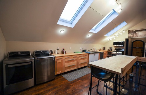 Very clean, high ceilings, and fully stocked with all of the amenities you should need for your stay. The main living space is a great spot to hang out, with open concept living/dining area featuring a nice sized kitchen and bar top. 2 couches. Bar and barstools with backs. Café table and 2 chairs.